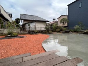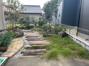 以前施工させていただいた枕木を使ったアプローチを壊して奥に行けるようにコンクリートを打ちます