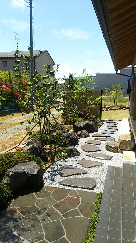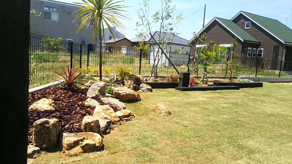 裏庭はテイスト変えてミカモ石と枕木を使って