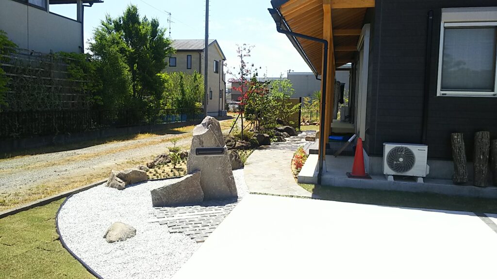 裏庭はテイスト変えてミカモ石と枕木を使って