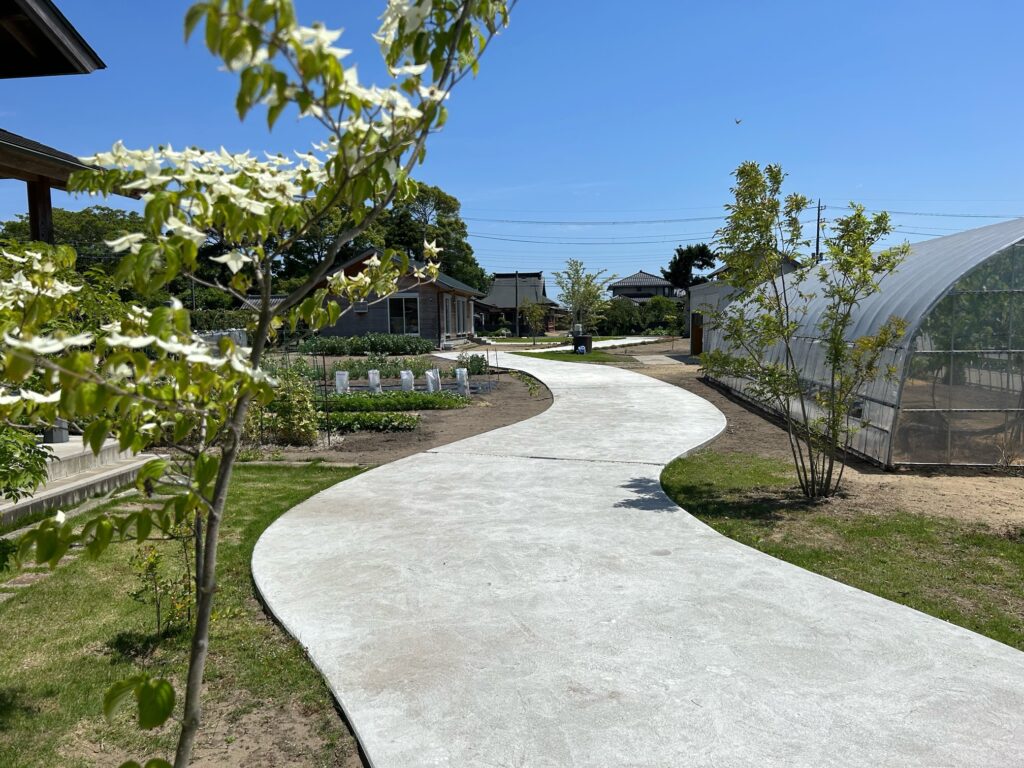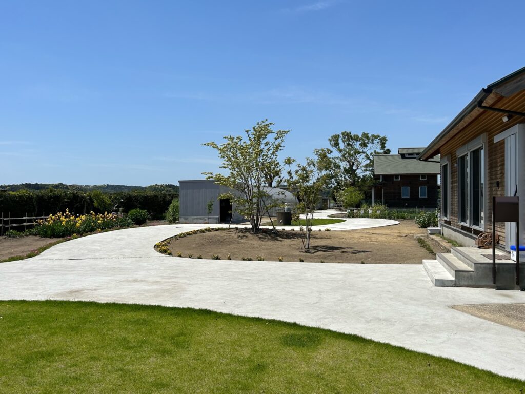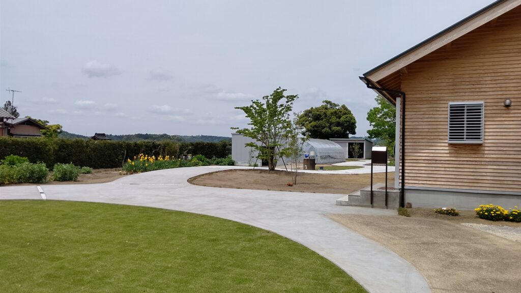 入り口には姫高麗芝。山の麓にはメインツリーの株立のヤマボウシ